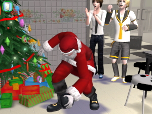 喜ぶレンと由、そして黒い塊を床に置くサンタさん。